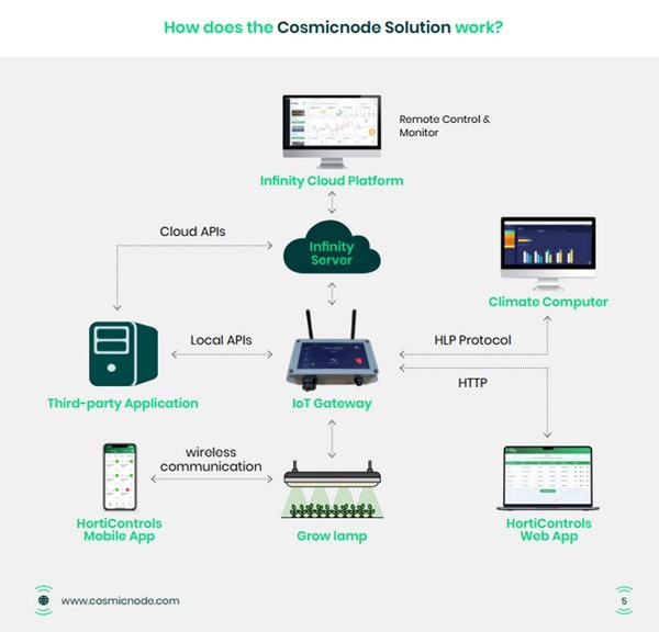 Cosmicnode's wireless control technology is one of the few solutions designed specifically for horticulture. The company originally developed its software for LED lighting control in offices and warehouses but quickly adapted it for greenhouse environments, where reliable and scalable control is essential. Their system is based on a wireless mesh network, ensuring robust performance in large-scale greenhouse operations.