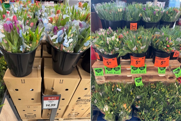 - Lidl: Buy 3 bouquets (7 tulips per bouquet) for 14.99 zł and get 3 more bouquets for free. That means the price per bouquet is 7.5 zł (€1.78).