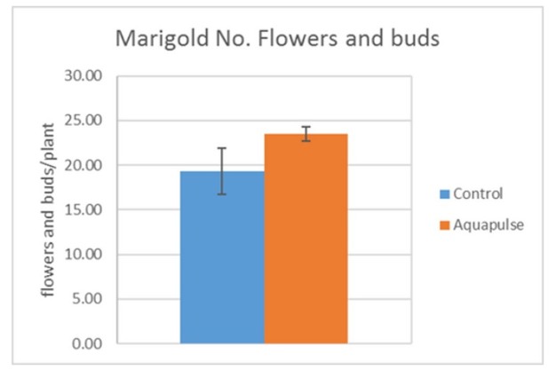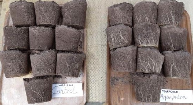 Marigold: 21% increase in flower and bud development, 29% greater fresh weigh, and greater white root development.