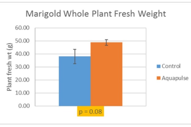 Initial trials of Aquapulse-treated water showed positive effects on several plant species, including tomatoes, lamb's lettuce, and marigolds, when irrigated with Aquapulse treated water versus those irrigated in untreated water: