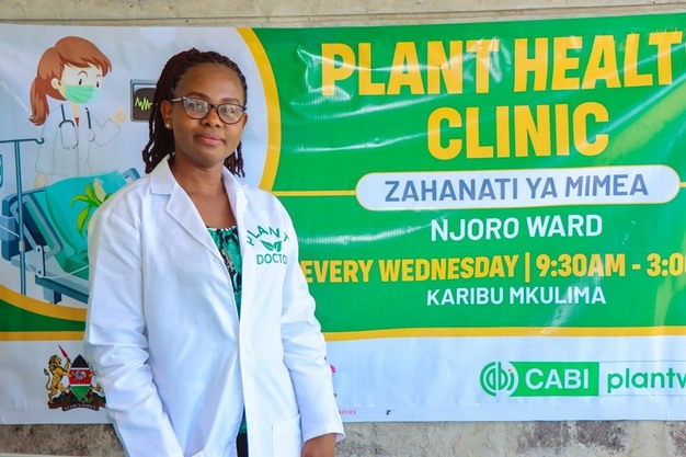 Even from afar, it's easy to spot Florence Malemba. She's wearing a white lab coat labeled "Plant Doctor", and a banner hangs behind where she's organizing her equipment, ready to assist her farmer-patients of the day. Florence is setting up her plant clinic in Njoro, an agricultural town southwest of Nakuru City, Kenya.