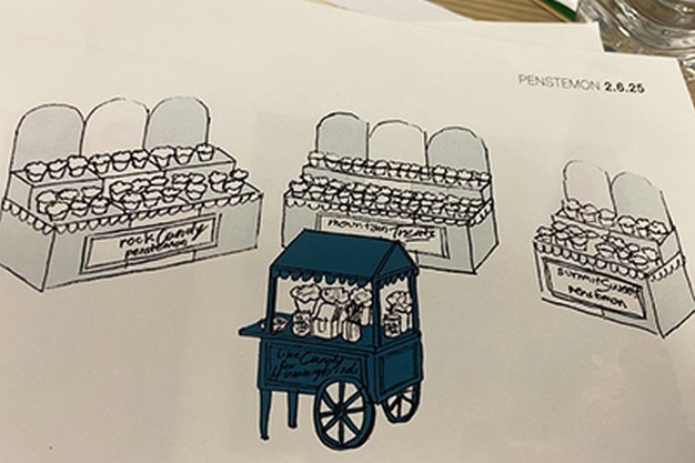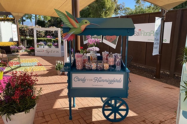 The concept of "Candy for hummingbirds" inspired a candy shop display for customers and hummingbirds alike. For those looking to add plants that attract hummingbirds to their assortment, the new Penstemon was a hit with both hummingbirds and customers.