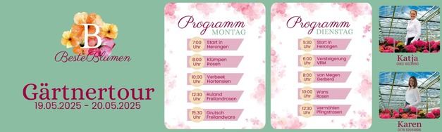 On May 19 and 20, 2025, BesteBlumen invites you to join the "Gärtnertour" – an exclusive opportunity to explore some of the most renowned horticultural businesses in the Lower Rhine region.