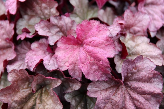 Heuchera 'Iridescent' has pearly foliage that changes from rose-pink to silver-lavender as the season progresses. Its leaves are held in a tight mound and shine in the garden as well as containers; 'Iridescent' also performs well as a blender and a standout in mass plantings, edges and borders.