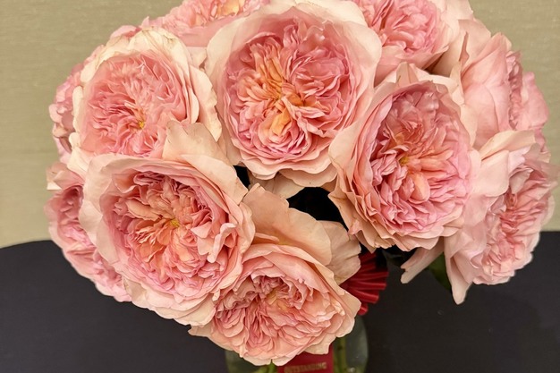 Phoebe (AUSCP17960) was awarded a Red Ribbon. Phoebe is bred by David Austin Roses and is part of the David Austin Wedding Roses collection. Phoebe is a vision of quiet beauty. As she blossoms, she confidently reveals a radiant rosette of richly colored flamingo-pink petals. A warm coral hue glows at her center before the color gently transitions from apricot orange to a soft, natural pink. Petite but strong, Phoebe delivers a captivating performance. Her light fragrance is fruity and floral, infused with soft violet notes and a touch of red apple.