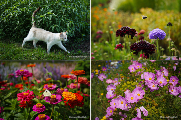 © Mirthe Walpot | FloralDaily.com Company cat Pixy loves a walk in the flowerfield; Scabiosa is very popular in dark colors, not only with clients but also with the bees; Cosmea; butterflies love the bright colored Zinnias.