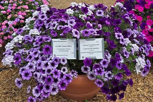 Confetti Garden Cosmic Blues is a Trio Mix which brings the magic of Milky Way to the garden with moody blues and a splash of sparkle. Featuring well-timed blooms from spring through early summer, this multi-species combo shines with Petunia Surprise Sparkle Blue Vein and it has built-in TMV resistance powered by Intrinsa for confident performance.