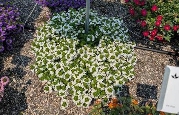 Scaevola Scala Cappello White is heat and drought-tolerant. This variety features crisp, white-fan shaped blooms that create a carpet of color. With excellent branching, medium vigor and a bushy habit, it is perfect for premium pots, baskets and the landscape.