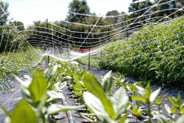 © Claire Kausch, NRCSZinnia seedlings grow beneath plant netting, a protective cover that keeps garden pests at bay and sometimes provides shade for plants
