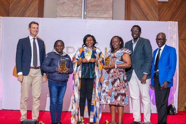 © Kenya Flower CouncilFrom left: Mr. Filippo Amato from the EU Delegation, Chris Kulei (KFC Board Chair), and Clement Tulezi (KFC CEO) pose with the winners of the Pinnacle Sustainability Golden Bloom Awards