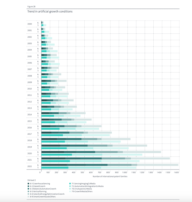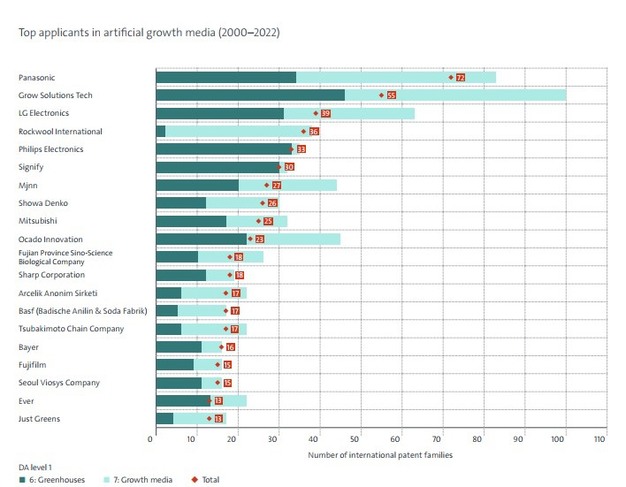 The timeline for specific innovations in greenhouses and growth media presented in Figure 28 shows a remarkable increase in digital technologies starting from a low level. The main applicant countries are the United States, Japan, China, Germany, Republic of Korea and the Netherlands. While the patents of many of the main actors relate to both greenhouses and artificial growth media, those of Philips and Signify specialise more in greenhouses