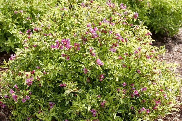 Bubbly Wine Weigela is a variegated selection of Fine Wine Weigela, known for its stable and vibrant foliage in shades of yellow, green, and burgundy. It is adaptable to full sun or partial shade and develops a compact, mounded habit, reaching 1.5–3′ in height and width. Its bloom period peaks in late spring with deep pink blossoms. The plant was bred by Jeff Good in Southeast Michigan.