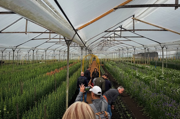 One of the stops was La Plazoletta, celebrating 40 years in the industry. Christian guided the group around the 40-hectare farm, where alstroemeria, solidago, snapdragon and statice are grown. With 700 employees – 80% of whom are women – the farm produces some 80,000 stems of alstroemeria per week, offering 40 different varieties. Social responsibility plays an important role: the company provides restaurants and even a kindergarten for people living close to the farm. Sustainability is also on the agenda, with rainwater covering 80% of the crop's needs, solar panels in the post-harvest area, and vacuum cooling technology (Dry-C) that ensures an optimal balance of temperature and humidity.