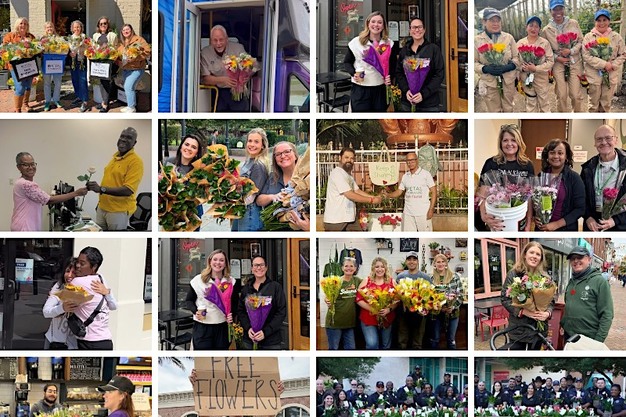 Further up the coast in Charleston, South Carolina, Tiger Lily Florist celebrated with a high-energy giveaway outside the Francis Marion Hotel, across from a busy city park. Owner Lisa Hays Holmes captured the moment in a Facebook reel tagged to fellow SAF members nationwide. "There's just something so fun about giving away flowers for free," she wrote, thanking Syndicate Sales and Mayesh Charleston for helping make it happen.