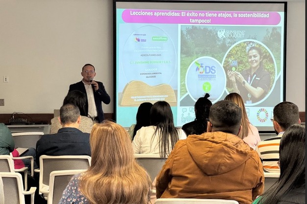 Several companies shared exemplary initiatives. Sunshine Bouquet presented its Reverdece Gualí program focused on ecological restoration and water source protection. Flores La Mana highlighted its Native Tree Propagation Program, while Guirnaldas Innovaflora SAS showcased its project The Hidden Value of Waste, which turns floral by-products into new resources through responsible reuse. Other companies such as Flores Ipanema, Colibrí Flowers, Agroindustrial Don Eusebio, and GHT took part in the panel Environmental Challenges and Sustainability in Floriculture, emphasizing innovation and collective action.