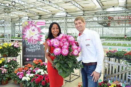 Sirekit Mol and Thomas Nass of Beekenkamp holding the new Dahlia Magiore. The Magiore is new in the LaBella series. There is only one plant in the container.