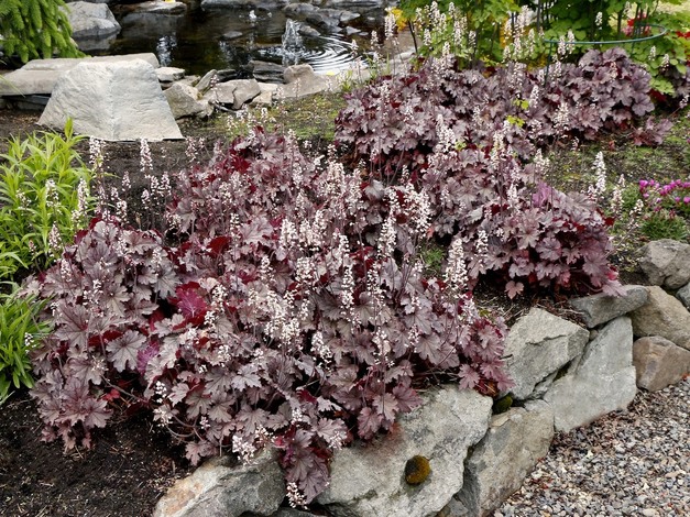 The Heucherella Cascade Series includes 'Copper Cascade,' a small-leaf trailer with rosy copper-gold foliage that holds its color year-round and drapes cleanly—ideal for spilling from window boxes and balcony planters. 'Copper Cascade', in comparison with 'Redstone Falls, sits lower, carries more flexible stems, shows smaller leaves, and presents a rosier, more saturated palette. 'Plum Cascade'—also in the ascade Series—is Terra Nova's first purple trailer, featuring ruffled purple-silver leaves, small light-pink summer flowers on short stems, and a strong, tidy habit that flows over raised beds and retaining walls with a smooth, continuous sweep.