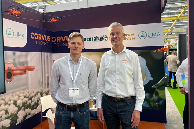 Mykhailo Yushchuk, GrowerAdviser, and Frans-Peter Dechering, Corvus Drones. The company announced the collaboration with three rose yield prediction expert companies: GrowerAdviser, Lima Labs and Scarab Solutions.