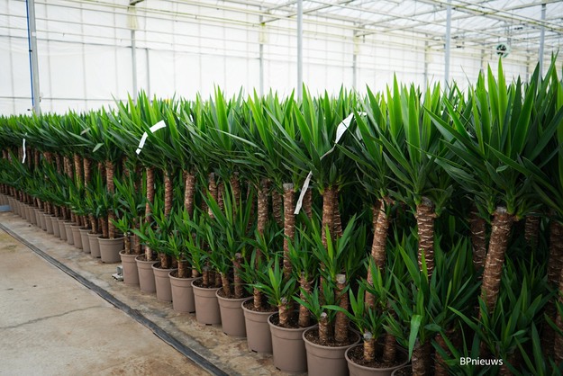 The indoor plant section relies for about half of its volume on yuccas, which have been grown at the nursery since 1973. From September onward, production ramps up so that the largest volumes are ready in January. Imports from Guatemala arrive every two weeks. Luiten Kwekerij offers a wide range of pot sizes, yet the yuccas always arrive with fixed stem heights to ensure consistently uniform batches.