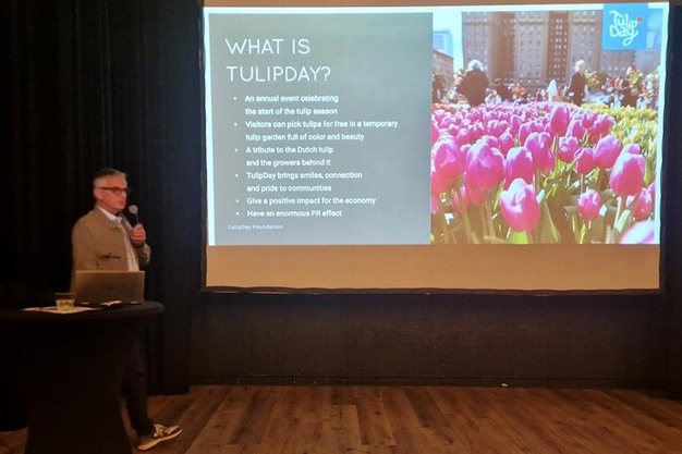 Afterwards, Paul Ras, the foundation's project manager, delivered a presentation. He explained how tulips and the creation of a tulip-picking garden can help connect communities. More than simply an iconic horticultural product, the tulip becomes a promotional tool that cities can use to strengthen their identity and stimulate local economic activity.