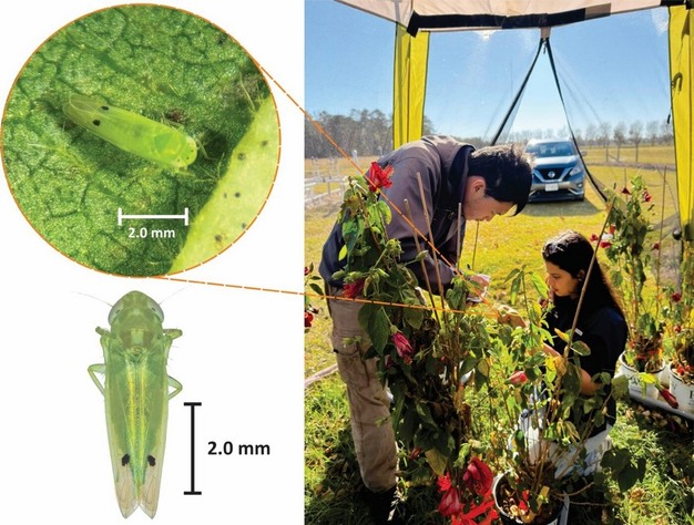 © Clemson UniversityLeft: Adult leafhopper observed on host foliage, with dorsal view and scale bar. Right: Nisha Yadav and Peilin Tan collecting field data during the chemical trial.