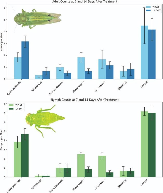 HachiHachi SC and Altus consistently reduced adult and nymph populations at both intervals. Mainspring GNL provided rapid adult knockdown at seven days, but populations rebounded by Day 14. Ventigra and Safari 20SG showed variable results, while Talstar Professional had mixed success against nymphs.