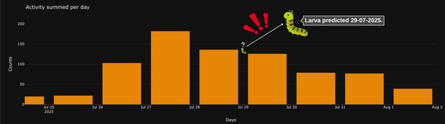 The improved detection also allows more accurate predictions of key life cycle stages. PATS-Vinder can predict the first caterpillars up to seven days in advance, helping growers plan labor, resources, and interventions at the right moment. This level of forecasting is possible because PATS-C tracks moth activity every night, something traditional monitoring tools cannot do. Early generations often go unnoticed in traps, which can lead to bigger issues later in the season.
