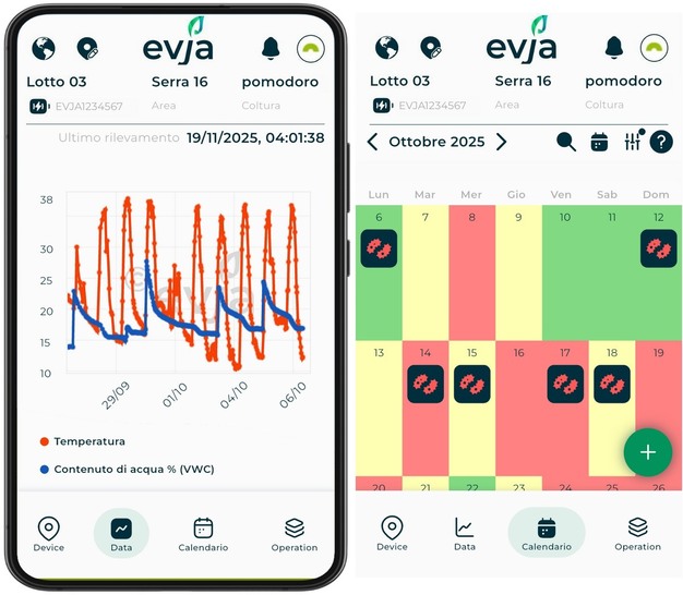 The EVJA control unit is at the heart of the Agronomic Intelligence Platform and has basic sensors. With the new app, you can view real-time graphs of soil moisture, temperature, and other climatic and crop parameters. You can also view past data organized by season, plot, or crop.