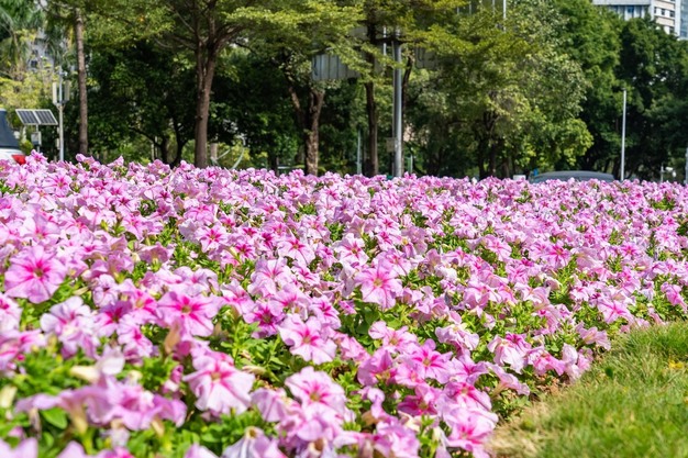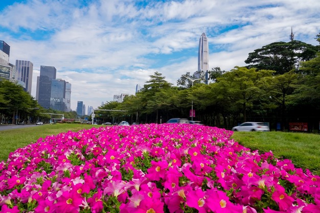 The flowers are Petunia 'Dream' series Pink Vein, a variety appearing at this scale in China for the first time. Bred by PanAmerican Seed and planted under the guidance of the Shenzhen Urban Greenery Management Department with work done by Luyuanfang Landscape, the installation has added a new visual marker to the avenue.