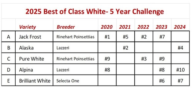At Poinsettia Variety Day, a blind vote was conducted to determine the 2025 Best of Class White – 5 Year Challenge. This contest pitted the five top finishing white varieties in the Non-Red class over the past five years. The varieties were Jack Frost, Alaska, Pure White, Alpina and Brilliant White. In a close competition, Brillant White garnered the winning vote count.