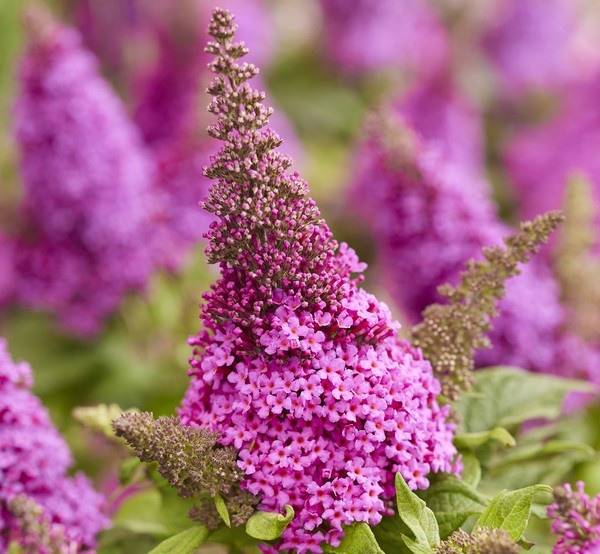 Butterfly Candy Lil Cerise features soft pink flower spikes with light fragrance and dense foliage. Blooming continues through summer, providing nectar for pollinators. Plants mature at 2–3 feet tall and wide and are hardy to Zone 5. This variety will also be available through the Butterfly Candy Buddleia collection.