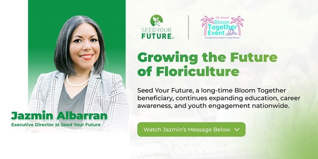 Jazmin also encourages other floral industry companies to support and collaborate with the 6th Annual Bloom Together Event, which donates proceeds to SYF and AFE to help grow the future of the floriculture industry. Donations will be used to advance floral research, education, workforce development, and more. Watch her message here: Watch Video.