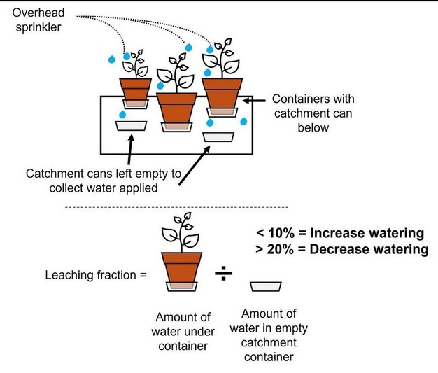 Leaching fractions can be determined by placing plants in catchment containers designed so that only leached water can enter and not overhead water. Then, place empty catchment containers randomly spaced throughout the irrigation zone to measure the total amount of water applied during irrigation. It is recommended that this test be conducted in groups of four (12-16 total catchment containers are sufficient). Apply the irrigation for the standard application time. Afterward, let the containers drain for approximately one hour, then measure the volume of water that leached from the plants. Divide that number by the volume of water that filled the empty catchment containers to determine the leaching fraction. For example, if the empty catchment containers each capture 4 cups of irrigation water and a catchment container under a plant holds 1 cup of leached water, the leaching fraction would be 25%. Note: When possible, placing plastic bags in the empty catchment containers can make it easier to measure the volume of irrigation water.