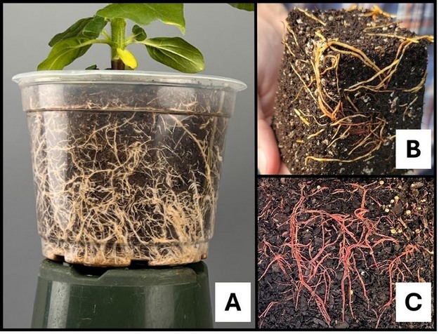 © Virginia Tech UniversityFigure 3. (A) Standard white healthy rooting. (B) Healthy brown roots of arborvitae. (C) Normal red roots of loropetalum.