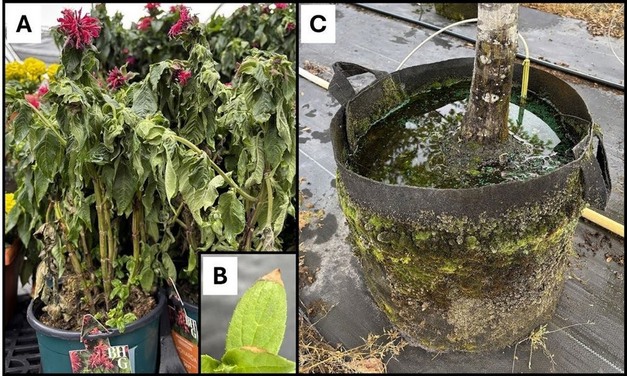 © Virginia Tech UniversityFigure 2. (A) A drought-stressed plant and (B) the beginning signs of leaf scorch. (C) Heavily overwatered rootzone conditions.