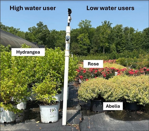Generally, plants with a large canopy or leaf area will use more water at faster rates; however, this is species- and cultivar-specific and is not always the case. For example, a fully grown azalea and spirea nursery stock can have similar leaf size and canopy area, but the spirea is going to deplete water reserves much faster.