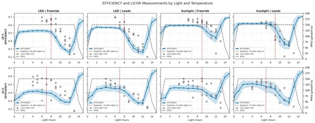 © GardinFigure 1. Gardin detected the drop in efficiency across cultivar, temperature and light source, with the timing of the drop varying between 7-9 hours of lights-on. Detection of the drop in efficiency was similar between Gardin and LI-COR.