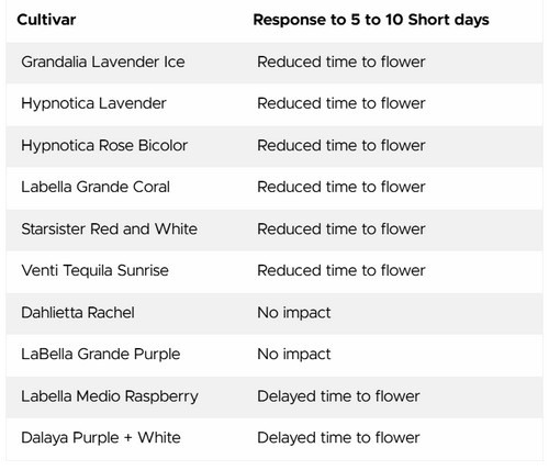 Table 1. The short-day response of different cultivars of dahlias.