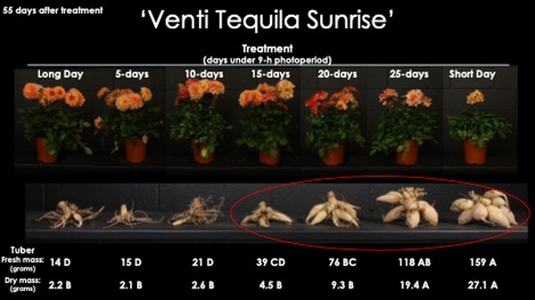 © Michigan State UniversityFigure 2. Fifty-five days after treatment, Dahlia 'Venti Tequila Sunrise' had significant tuber production and produced fewer flowers, resulting in lower-quality potted dahlias when exposed to 15 or more short days.