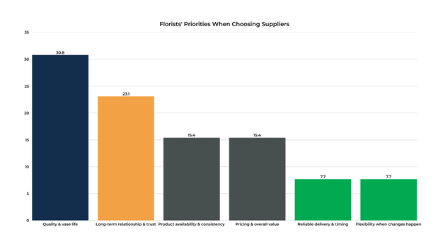 When it came to choosing suppliers, quality remained the top priority. Florists identified quality and vase life (30.8%) as the most important factor, followed by long-term relationships and trust (23.1%).