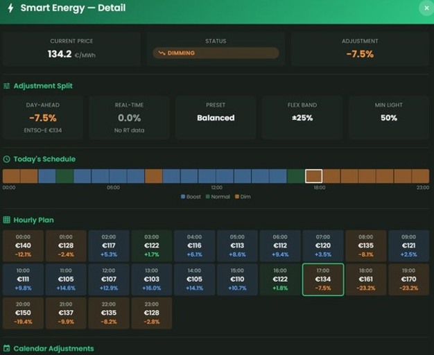 Netvion's Smart Energy module reads the next day's hourly price forecast each afternoon and builds a lighting schedule that concentrates intensity in cheaper hours and reduces it during expensive peaks — while keeping the crop's daily DLI target fully intact. Shifting 1.5 hours of full-intensity load from peak to low-price periods saves roughly €100 to €165 on a typical high-spread day. Across the 80 to 100 days per season where the price difference is significant, that compounds to €10,000 to €16,000 per hectare per year — without any reduction in what the crop receives.