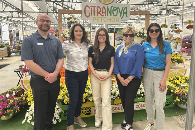 Petchoa is a brand-new genus for the team at Ball FloraPlant. This cold-tolerant hybrid features the bright colors of calibrachoa combined with the large blooms and strong roots of petunias. CitraNova Limone and CitraNova Lemon Zest last long into the season. Some of the trial presenters are in front of the "freshly-squeezed color" display (from left to right): Henry Roberts, Sarah Swofford-Hernandez, Jaden Gimondo, Maria Bolinger, and Claire Melvin.
