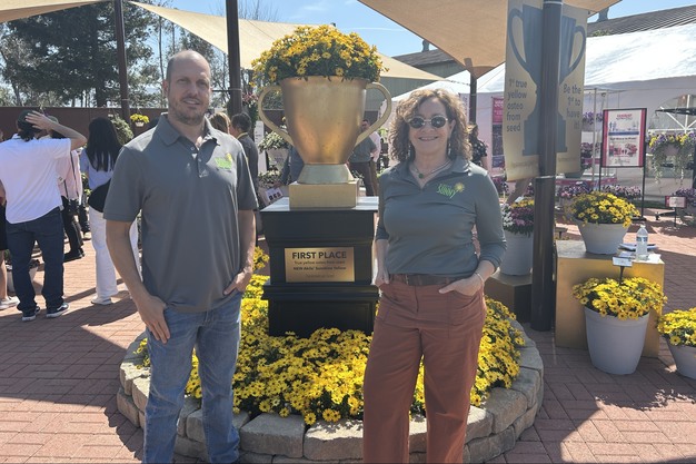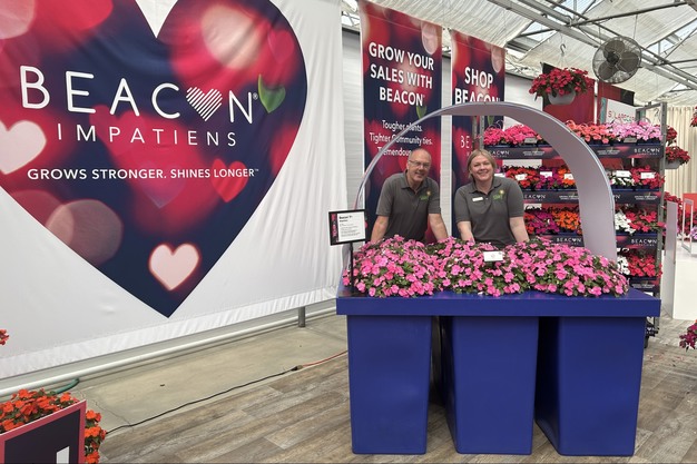 Mark Gross (left) and Kat Wolper (right) are smiling next to new Impatiens Beacon Pink – a disease-resistant option for the shade that stands up to Impatiens downy mildew. Guests to the trials are having fun taking photos next to this life-size six-pack. The new branded dark-blue color will be available for 2027.