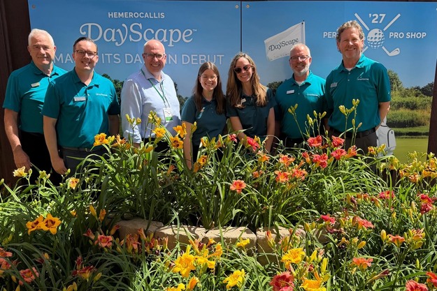 © Ball Horticultural CompanyThe Darwin Perennials team showcases its new Hemerocallis series at California Spring Trials. The Daylily DayScape assortment launches with nine colors that are highly resistant to rust and disease. They have a high bud count and are self-cleaning and cold opening. Left to right: Karl Batschke, Mike Annes, Alan Rouse, Sarah Greenwood, Sara Mellard, Chris Fifo, and Darren Barshaw.