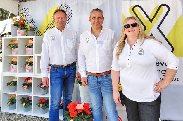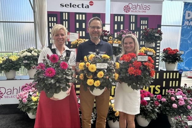 There's been great conversation around the new City Lights Compact series of patio dahlia from Selecta One at California Spring Trials. The dark-colored foliage contrasts beautifully with the bright blooms. Team members are holding the three new colors: Tanya Carvalho (Magenta), Stefan Reiner (Sunny Yellow), and Lauren Blume (Scarlet).