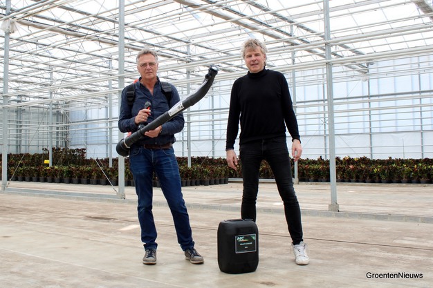 Koos Evenblij and inventor Jaap van der Spek visited Ammerlaan The Green Innovator in Pijnacker on a sunny Thursday in mid-March to coat a new section of greenhouse. "We are here to demonstrate the unique performance of the product, not to run tests," Koos emphasises. "Testing has been done extensively. The technology has been thoroughly described in scientific literature."