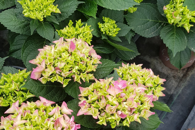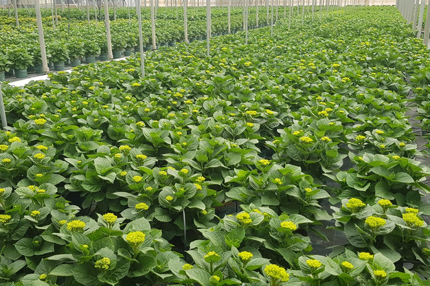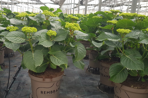 Hydrangea supply covers a wide range of formats, from 14 to 35 centimeter pots, in traditional colors such as white, red, pink, and blue or lilac. This is complemented by differentiated varieties such as the Rembrandt hydrangea, a royalty based variety known for its longer shelf life and innovative colors like vibrant green or glory red.