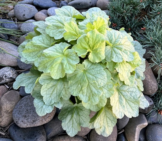 Heuchera 'Sea Glass' grows with a moderate, clumping habit and brings a breath of coastal calm to gardens with its soft mint-lime, gently ruffled leaves that glow like sunlit sea glass. The new variety offers slender stems in the summer that burst with delicate white-sand blooms from May through June, adding a soft shimmer to the scene. 'Sea Glass' is deer-resistant and drought-tolerant once established and strongly attracts pollinators. It displays nice winter color, adding immense landscape value to woodland borders, shade gardens and containers.