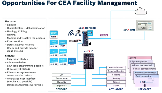 In a sector where growers have watched well-funded companies disappear and leave them stranded mid-build, the question of vendor stability is not abstract. Wagg addresses it directly. "You don't have to fear that our company is going away," he says. ctrlX is already deployed across Fortune 500 manufacturers, as Bosch Rexroth's footprint spans over 80 countries from its established expertise within factory automation. The CEA division is one of several new markets, alongside wastewater treatment and smart building automation, that ctrlX has opened up.