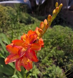 Crocosmia NOVA 'Ember' presents an upright growth habit and boasts dense heads of orange flowers, edged in electric coral. This variety's non-invasive clumps are powerful pollinator and